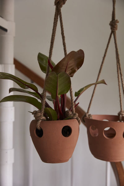 Earthy & easy on the eyes, the small Serralles Hanging Pot offers dimension & a mix of color & pattern to a corner of the room with its decorative cutout holes & hanging knotted jute rope. Unglazed terracotta on the outside gives this sculptural piece a natural look, while the glazed interior makes the pot watertight. Add a trailing drop-in plant to drape over the top or through the holes for a lovely green contrast.